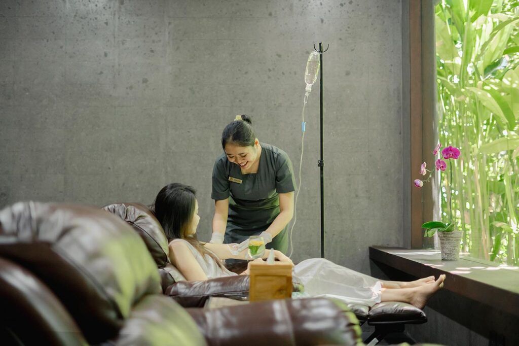 IV Drip Therapy at our wellness center in Ubud, Bali is a fast, effective way to deliver essential nutrients directly into your bloodstream. In just 60 minutes, it helps boost immunity, fight fatigue, support anti-aging, rehydrate the body, and improve the health of your skin, hair, and nails. A powerful reset for overall wellness and vitality.